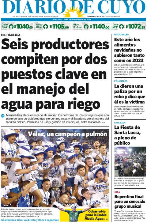 Diario de Cuyo | HOME | Edición impresa Tapa Edición 16 de Diciembre de 2024 Por Redacción Diario de Cuyo 16/12/2024 · 4:00 Escuchar la noticia Escuchar la noticia Your browser doesn’t support HTML5 audio Ver los comentarios ›