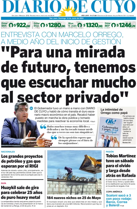 Diario de Cuyo | HOME | Edición impresa Tapa Edición 16 de Junio del 2024 Por Redacción Diario de Cuyo 16/06/2024 · 4:00 Escuchar la noticia Escuchar la noticia Your browser doesn’t support HTML5 audio Ver los comentarios ›