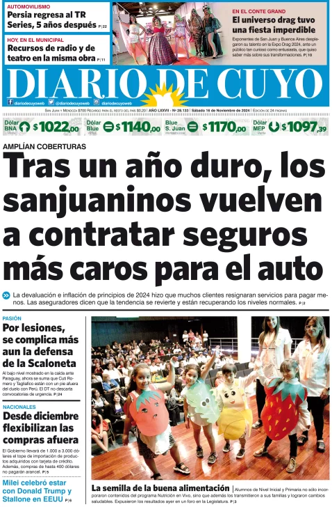 Diario de Cuyo | HOME | Edición impresa Tapa Edición 16 de Noviembre de 2024 Por Redacción Diario de Cuyo 16/11/2024 · 4:00 Escuchar la noticia Escuchar la noticia Your browser doesn’t support HTML5 audio Ver los comentarios ›