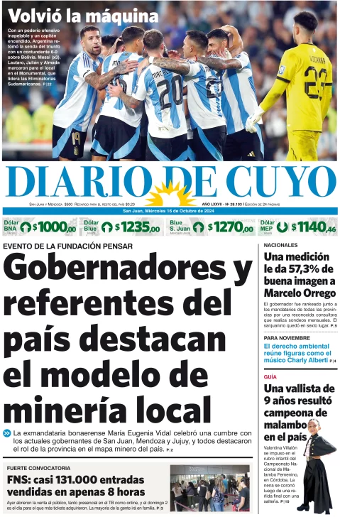 Diario de Cuyo | HOME | Edición impresa Tapa Edición 16 de Octubre de 2024 Por Redacción Diario de Cuyo 16/10/2024 · 4:00 Escuchar la noticia Escuchar la noticia Your browser doesn’t support HTML5 audio Ver los comentarios ›