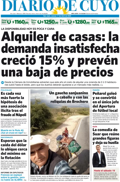 Diario de Cuyo | HOME | Edición impresa Tapa Edición 17 de Abril de 2025 Por Redacción Diario de Cuyo 17/04/2025 · 4:00 Escuchar la noticia Escuchar la noticia Your browser doesn’t support HTML5 audio Ver los comentarios ›