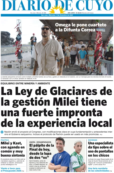 Diario de Cuyo | HOME | Edición impresa Tapa Edición 17 de Diciembre del 2025 Por Redacción Diario de Cuyo 17/12/2025 · 4:00 Escuchar la noticia Escuchar la noticia Your browser doesn’t support HTML5 audio Ver los comentarios ›