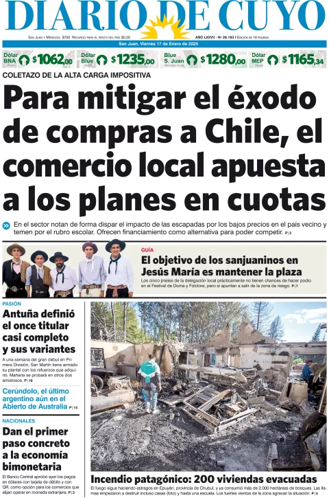 Diario de Cuyo | HOME | Edición impresa Tapa Edición 17 de Enero del 2024 Por Redacción Diario de Cuyo 17/01/2025 · 4:00 Escuchar la noticia Escuchar la noticia Your browser doesn’t support HTML5 audio Ver los comentarios ›