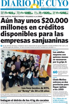 Diario de Cuyo | HOME | Edición impresa Tapa Edición 17 de Junio de 2024 Por Redacción Diario de Cuyo 17/06/2024 · 4:00 Escuchar la noticia Escuchar la noticia Your browser doesn’t support HTML5 audio Ver los comentarios ›