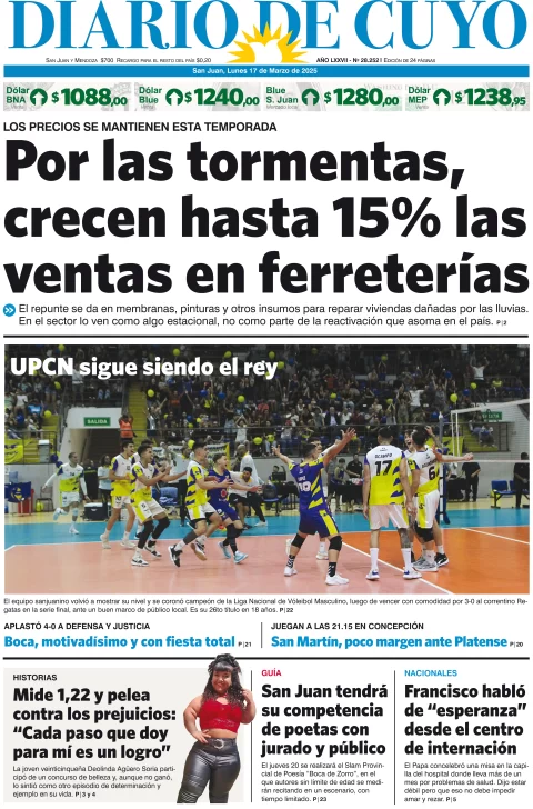 Diario de Cuyo | HOME | Edición impresa Tapa Edición 17 de Marzo del 2025 Por Redacción Diario de Cuyo 17/03/2025 · 4:00 Escuchar la noticia Escuchar la noticia Your browser doesn’t support HTML5 audio Ver los comentarios ›