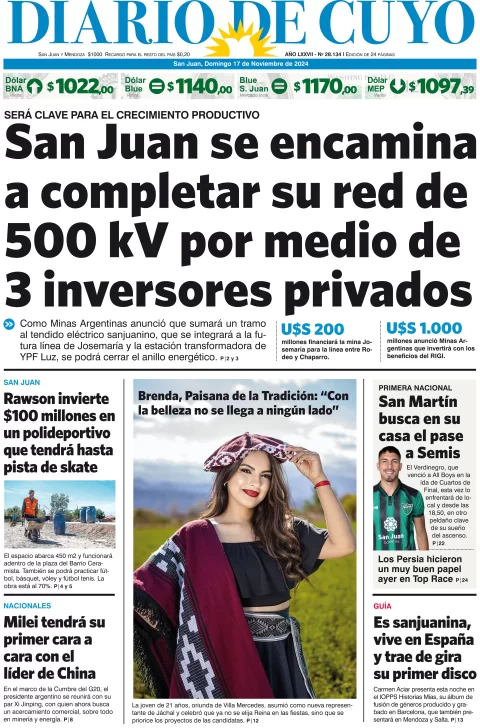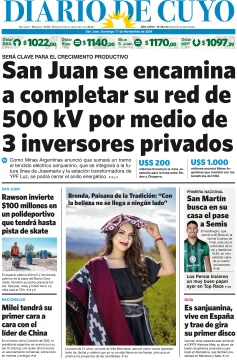 Diario de Cuyo | HOME | Edición impresa Tapa Edición 17 de Noviembre del 2024 Por Redacción Diario de Cuyo 17/11/2024 · 4:00 Escuchar la noticia Escuchar la noticia Your browser doesn’t support HTML5 audio Ver los comentarios ›