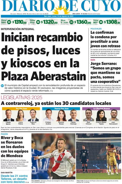Diario de Cuyo | HOME | Edición impresa Tapa Edición 18 de Agosto del 2025 Por Redacción Diario de Cuyo 18/08/2025 · 4:00 Escuchar la noticia Escuchar la noticia Your browser doesn’t support HTML5 audio Ver los comentarios ›
