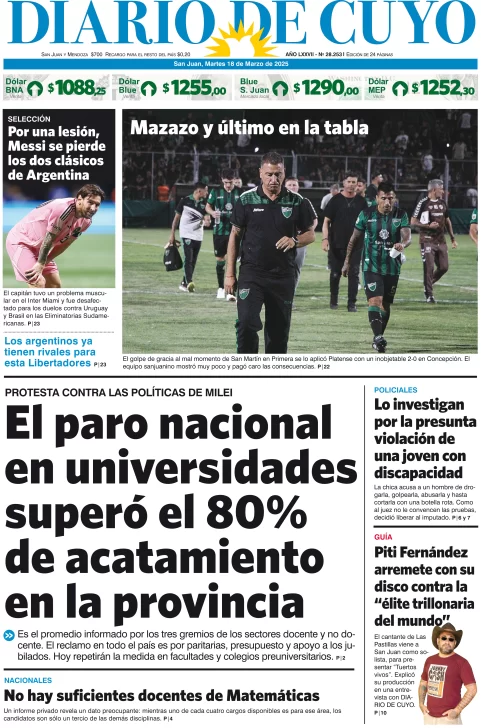 Diario de Cuyo | HOME | Edición impresa Tapa Edición 18 de Marzo de 2025 Por Redacción Diario de Cuyo 18/03/2025 · 4:00 Escuchar la noticia Escuchar la noticia Your browser doesn’t support HTML5 audio Ver los comentarios ›