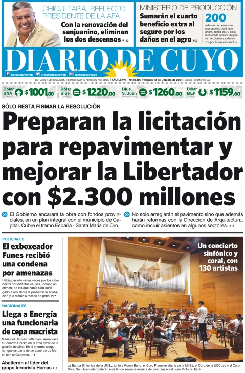 Diario de Cuyo | HOME | Edición impresa Tapa Edición 18 de Octubre de 2024 Por Redacción Diario de Cuyo 18/10/2024 · 4:00 Escuchar la noticia Escuchar la noticia Your browser doesn’t support HTML5 audio Ver los comentarios ›