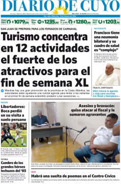 Diario de Cuyo | HOME | Edición impresa Tapa Edición 19 de Febrero del 2025 Por Redacción Diario de Cuyo 19/02/2025 · 4:00 Escuchar la noticia Escuchar la noticia Your browser doesn’t support HTML5 audio Ver los comentarios ›