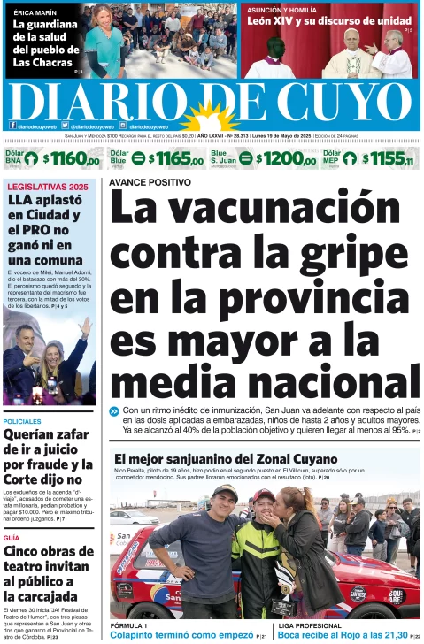 Diario de Cuyo | HOME | Edición impresa Tapa Edición 19 de Mayo del 2025 Por Redacción Diario de Cuyo 19/05/2025 · 4:00 Escuchar la noticia Escuchar la noticia Your browser doesn’t support HTML5 audio Ver los comentarios ›