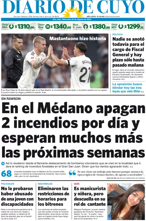Diario de Cuyo | HOME | Edición impresa Tapa Edición 20 de Agosto de 2025 Por Redacción Diario de Cuyo 20/08/2025 · 4:00 Escuchar la noticia Escuchar la noticia Your browser doesn’t support HTML5 audio Ver los comentarios ›