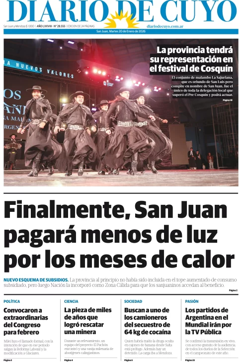 Diario de Cuyo | HOME | Edición impresa Tapa Edición 20 de Enero 2026 Por Redacción Diario de Cuyo 20/01/2026 · 4:00 Escuchar la noticia Escuchar la noticia Your browser doesn’t support HTML5 audio Ver los comentarios ›