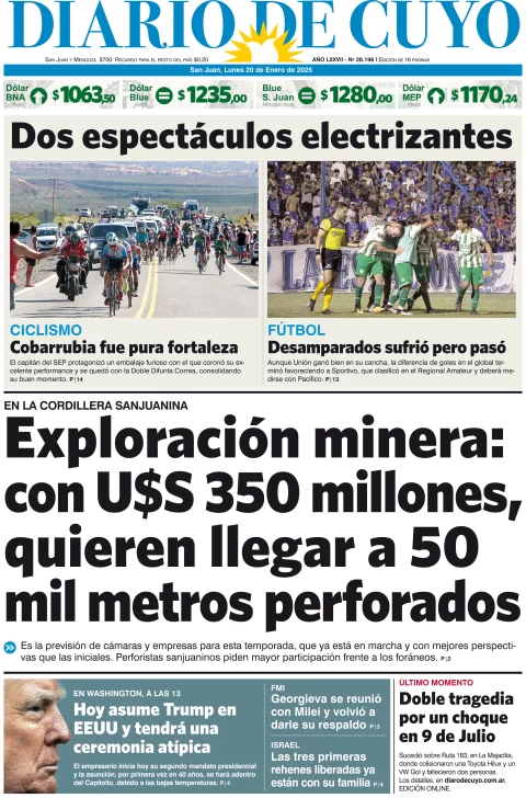 Diario de Cuyo | HOME | Edición impresa Tapa Edición 20 de Enero del 2025 Por Redacción Diario de Cuyo 20/01/2025 · 4:00 Escuchar la noticia Escuchar la noticia Your browser doesn’t support HTML5 audio Ver los comentarios ›