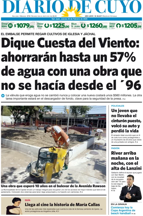 Diario de Cuyo | HOME | Edición impresa Tapa Edición 20 de Febrero del 2025 Por Redacción Diario de Cuyo 20/02/2025 · 4:00 Escuchar la noticia Escuchar la noticia Your browser doesn’t support HTML5 audio Ver los comentarios ›