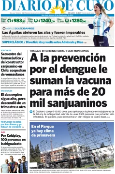 Diario de Cuyo | HOME | Edición impresa Tapa Edición 20 de Septiembre del 2024 Por Redacción Diario de Cuyo 20/09/2024 · 4:00 Escuchar la noticia Escuchar la noticia Your browser doesn’t support HTML5 audio Ver los comentarios ›
