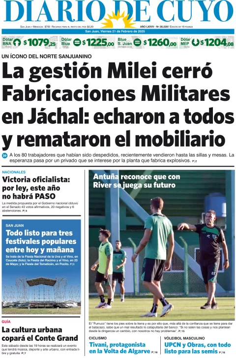 Diario de Cuyo | HOME | Edición impresa Tapa Edición 21 de Febrero del 2025 Por Redacción Diario de Cuyo 21/02/2025 · 4:00 Escuchar la noticia Escuchar la noticia Your browser doesn’t support HTML5 audio Ver los comentarios ›