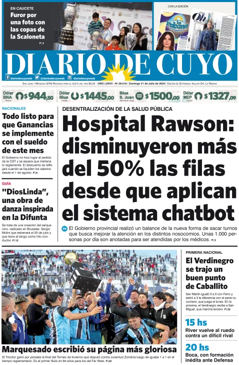 Diario de Cuyo | HOME | Edición impresa Tapa Edición 21 de Julio de 2024 Por Redacción Diario de Cuyo 21/07/2024 · 4:00 Escuchar la noticia Escuchar la noticia Your browser doesn’t support HTML5 audio Ver los comentarios ›
