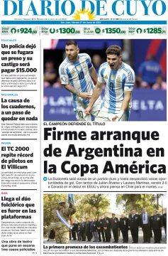 Diario de Cuyo | HOME | Edición impresa Tapa Edición 21 de Junio del 2024 Por Redacción Diario de Cuyo 21/06/2024 · 4:00 Escuchar la noticia Escuchar la noticia Your browser doesn’t support HTML5 audio Ver los comentarios ›