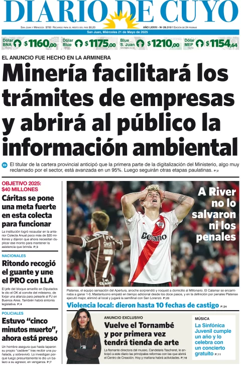 Diario de Cuyo | HOME | Edición impresa Tapa Edición 21 de Mayo de 2025 Por Redacción Diario de Cuyo 21/05/2025 · 4:00 Escuchar la noticia Escuchar la noticia Your browser doesn’t support HTML5 audio Ver los comentarios ›