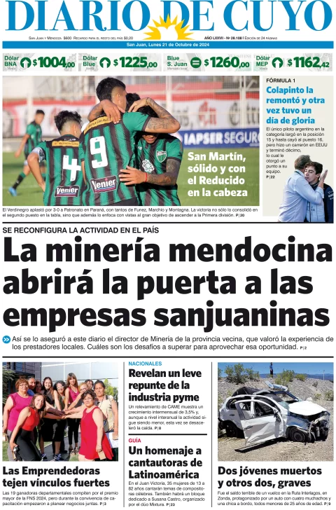 Diario de Cuyo | HOME | Edición impresa Tapa Edición 21 de Octubre del 2024 Por Redacción Diario de Cuyo 21/10/2024 · 4:00 Escuchar la noticia Escuchar la noticia Your browser doesn’t support HTML5 audio Ver los comentarios ›