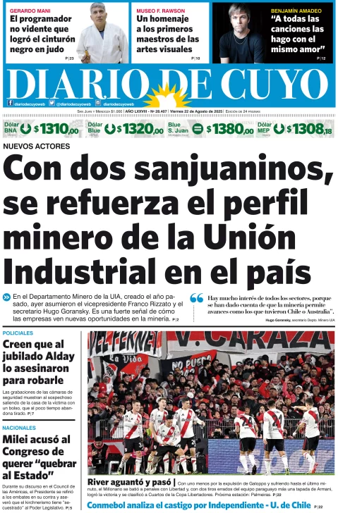 Diario de Cuyo | HOME | Edición impresa Tapa Edición 22 de Agosto de 2025 Por Redacción Diario de Cuyo 22/08/2025 · 4:00 Escuchar la noticia Escuchar la noticia Your browser doesn’t support HTML5 audio Ver los comentarios ›