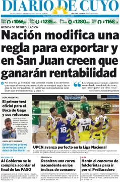 Diario de Cuyo | HOME | Edición impresa Tapa Edición 22 de Enero de 2025 Por Redacción Diario de Cuyo 22/01/2025 · 4:00 Escuchar la noticia Escuchar la noticia Your browser doesn’t support HTML5 audio Ver los comentarios ›