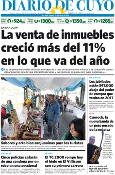 Diario de Cuyo | HOME | Edición impresa Tapa Edición 22 de Junio del 2024 Por Redacción Diario de Cuyo 22/06/2024 · 4:00 Escuchar la noticia Escuchar la noticia Your browser doesn’t support HTML5 audio Ver los comentarios ›