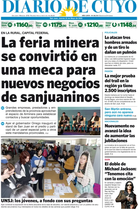 Diario de Cuyo | HOME | Edición impresa Tapa Edición 22 de Mayo de 2025 Por Redacción Diario de Cuyo 22/05/2025 · 4:00 Escuchar la noticia Escuchar la noticia Your browser doesn’t support HTML5 audio Ver los comentarios ›
