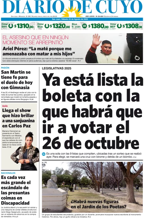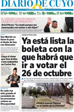 Diario de Cuyo | HOME | Edición impresa Tapa Edición 23 de Agosto de 2025 Por Redacción Diario de Cuyo 23/08/2025 · 4:00 Escuchar la noticia Escuchar la noticia Your browser doesn’t support HTML5 audio Ver los comentarios ›