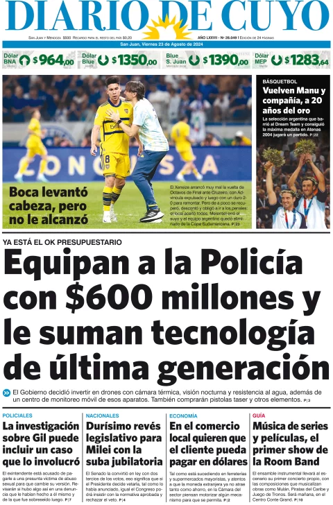 Diario de Cuyo | HOME | Edición impresa Tapa Edición 23 de Agosto del 2024 Por Redacción Diario de Cuyo 23/08/2024 · 4:00 Escuchar la noticia Escuchar la noticia Your browser doesn’t support HTML5 audio Ver los comentarios ›