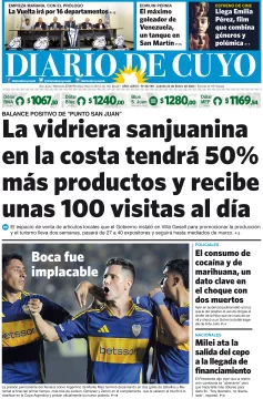 Diario de Cuyo | HOME | Edición impresa Tapa Edición 23 de Enero de 2025 Por Redacción Diario de Cuyo 23/01/2025 · 3:30 Escuchar la noticia Escuchar la noticia Your browser doesn’t support HTML5 audio Ver los comentarios ›