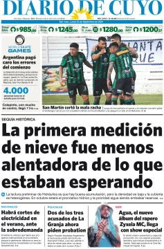 Diario de Cuyo | HOME | Edición impresa Tapa Edición 23 de Septiembre del 2024 Por Redacción Diario de Cuyo 23/09/2024 · 4:00 Escuchar la noticia Escuchar la noticia Your browser doesn’t support HTML5 audio Ver los comentarios ›