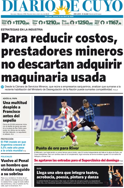 Diario de Cuyo | HOME | Edición impresa Tapa Edición 24 de Abril de 2025 Por Redacción Diario de Cuyo 24/04/2025 · 4:00 Escuchar la noticia Escuchar la noticia Your browser doesn’t support HTML5 audio Ver los comentarios ›