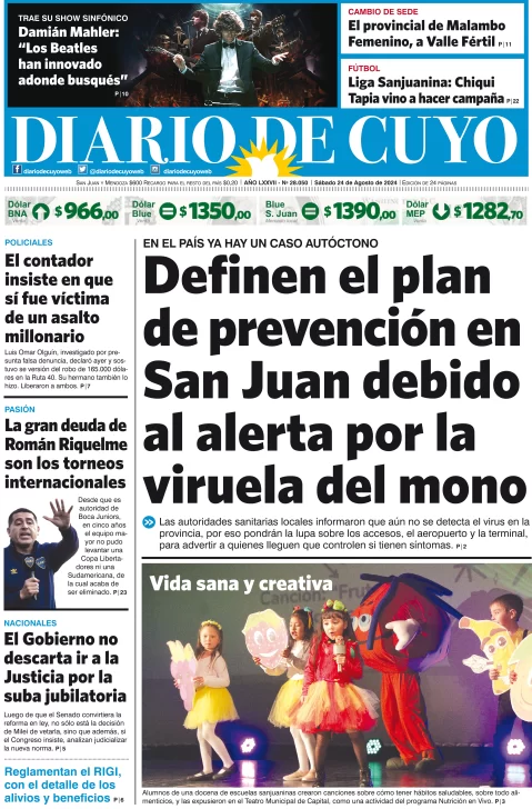 Diario de Cuyo | HOME | Edición impresa Tapa Edición 24 de Agosto del 2024 Por Redacción Diario de Cuyo 24/08/2024 · 4:00 Escuchar la noticia Escuchar la noticia Your browser doesn’t support HTML5 audio Ver los comentarios ›