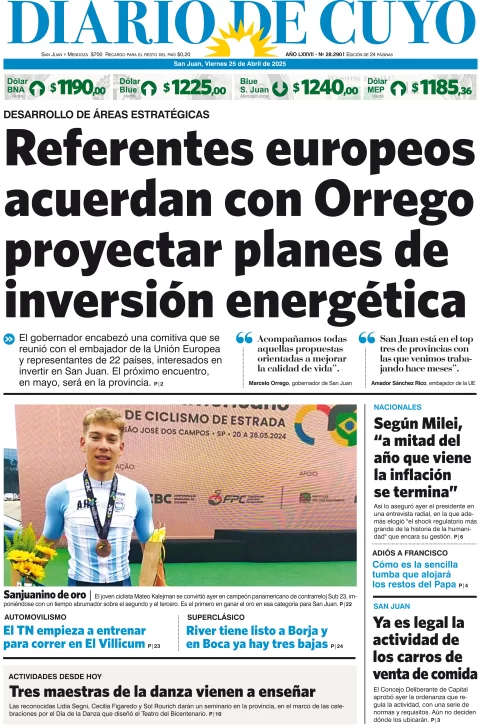Diario de Cuyo | HOME | Edición impresa Tapa Edición 25 de Abril de 2025 Por Redacción Diario de Cuyo 25/04/2025 · 4:00 Escuchar la noticia Escuchar la noticia Your browser doesn’t support HTML5 audio Ver los comentarios ›