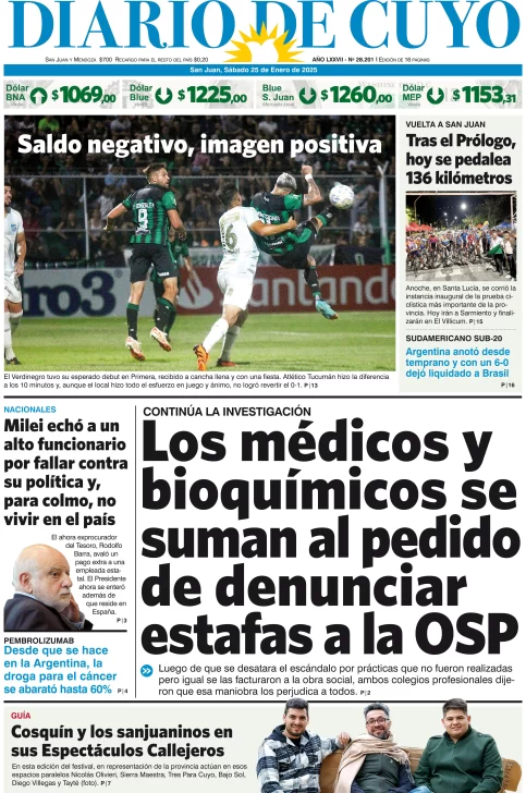 Diario de Cuyo | HOME | Edición impresa Tapa Edición 25 de Enero de 2025 Por Redacción Diario de Cuyo 25/01/2025 · 4:00 Escuchar la noticia Escuchar la noticia Your browser doesn’t support HTML5 audio Ver los comentarios ›