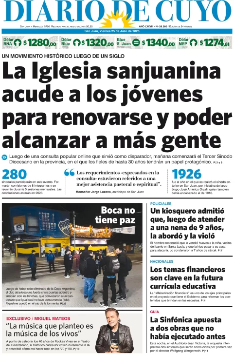 Diario de Cuyo | HOME | Edición impresa Tapa Edición 25 de Julio de 2025 Por Redacción Diario de Cuyo 25/07/2025 · 4:00 Escuchar la noticia Escuchar la noticia Your browser doesn’t support HTML5 audio Ver los comentarios ›
