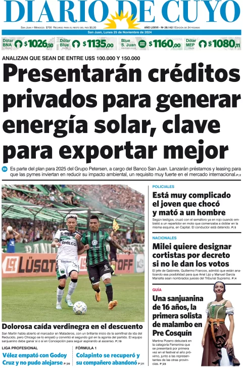 Diario de Cuyo | HOME | Edición impresa Tapa Edición 25 de Noviembre del 2024 Por Redacción Diario de Cuyo 25/11/2024 · 5:00 Escuchar la noticia Escuchar la noticia Your browser doesn’t support HTML5 audio Ver los comentarios ›