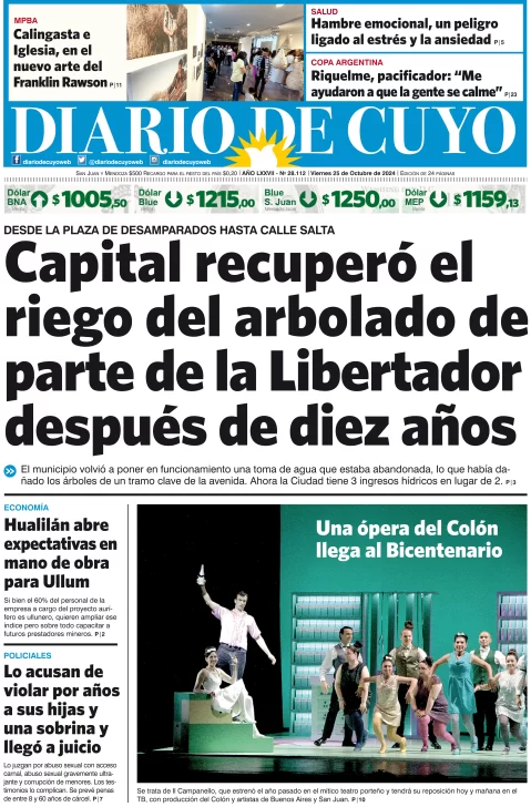Diario de Cuyo | HOME | Edición impresa Tapa Edición 25 de Octubre de 2024 Por Redacción Diario de Cuyo 25/10/2024 · 4:00 Escuchar la noticia Escuchar la noticia Your browser doesn’t support HTML5 audio Ver los comentarios ›