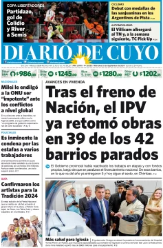 Diario de Cuyo | HOME | Edición impresa Tapa Edición 25 de Septiembre del 2024 Por Redacción Diario de Cuyo 25/09/2024 · 4:00 Escuchar la noticia Escuchar la noticia Your browser doesn’t support HTML5 audio Ver los comentarios ›