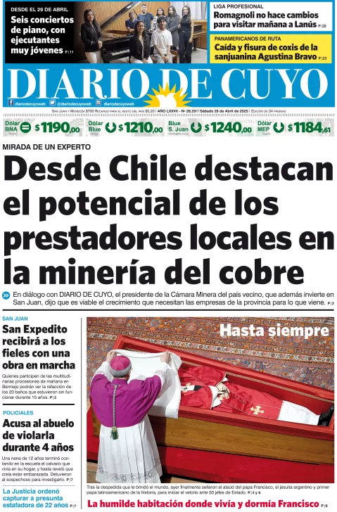 Diario de Cuyo | HOME | Edición impresa Tapa Edición 26 de Abril de 2025 Por Redacción Diario de Cuyo 26/04/2025 · 4:00 Escuchar la noticia Escuchar la noticia Your browser doesn’t support HTML5 audio Ver los comentarios ›