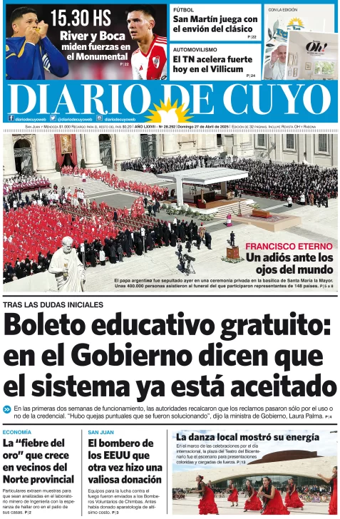 Diario de Cuyo | HOME | Edición impresa Tapa Edición 27 de Abril de 2025 Por Redacción Diario de Cuyo 27/04/2025 · 4:00 Escuchar la noticia Escuchar la noticia Your browser doesn’t support HTML5 audio Ver los comentarios ›