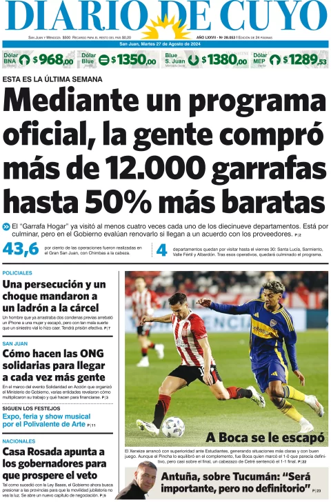 Diario de Cuyo | HOME | Edición impresa Tapa Edición 27 de Agosto del 2024 Por Redacción Diario de Cuyo 27/08/2024 · 4:00 Escuchar la noticia Escuchar la noticia Your browser doesn’t support HTML5 audio Ver los comentarios ›