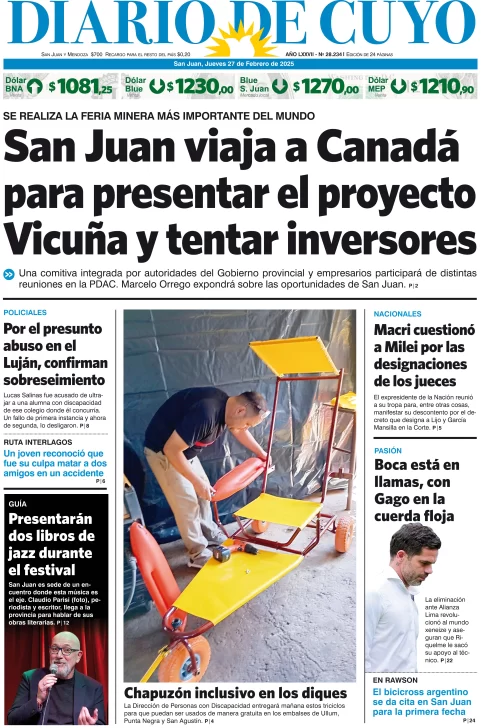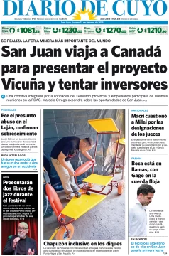 Diario de Cuyo | HOME | Edición impresa Tapa Edición 27 de Febrero de 2025 Por Redacción Diario de Cuyo 27/02/2025 · 4:00 Escuchar la noticia Escuchar la noticia Your browser doesn’t support HTML5 audio Ver los comentarios ›
