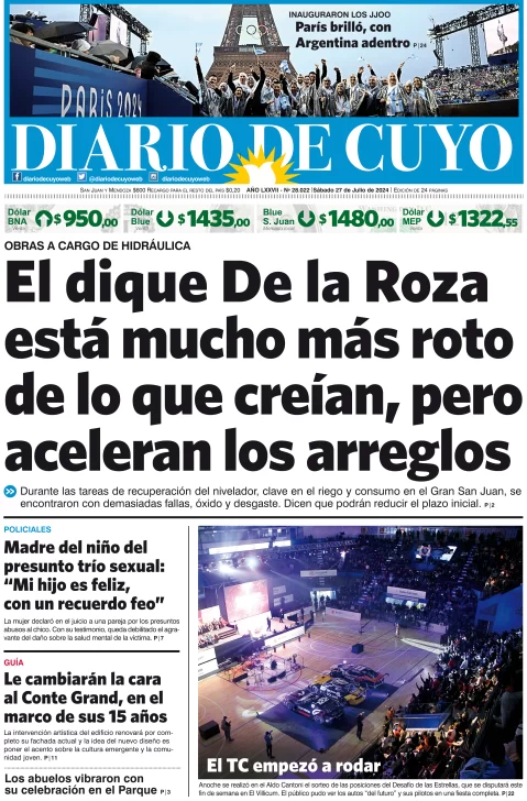 Diario de Cuyo | HOME | Edición impresa Tapa Edición 27 de Julio del 2024 Por Redacción Diario de Cuyo 27/07/2024 · 4:00 Escuchar la noticia Escuchar la noticia Your browser doesn’t support HTML5 audio Ver los comentarios ›