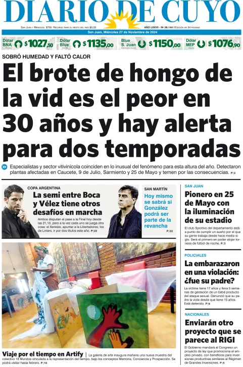 Diario de Cuyo | HOME | Edición impresa Tapa Edición 27 de Noviembre de 2024 Por Redacción Diario de Cuyo 27/11/2024 · 4:00 Escuchar la noticia Escuchar la noticia Your browser doesn’t support HTML5 audio Ver los comentarios ›