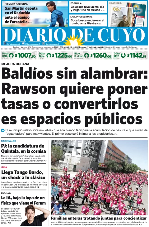 Diario de Cuyo | HOME | Edición impresa Tapa Edición 27 de Octubre de 2024 Por Redacción Diario de Cuyo 27/10/2024 · 4:00 Escuchar la noticia Escuchar la noticia Your browser doesn’t support HTML5 audio Ver los comentarios ›