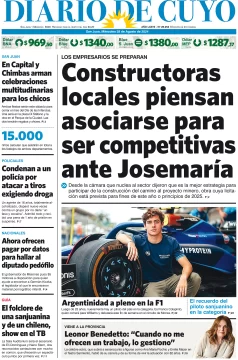 Diario de Cuyo | HOME | Edición impresa Tapa Edición 28 de Agosto del 2024 Por Redacción Diario de Cuyo 28/08/2024 · 4:00 Escuchar la noticia Escuchar la noticia Your browser doesn’t support HTML5 audio Ver los comentarios ›