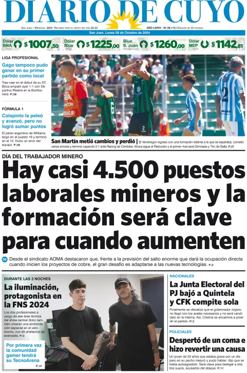 Diario de Cuyo | HOME | Edición impresa Tapa Edición 28 de Octubre del 2024 Por Redacción Diario de Cuyo 28/10/2024 · 4:00 Escuchar la noticia Escuchar la noticia Your browser doesn’t support HTML5 audio Ver los comentarios ›